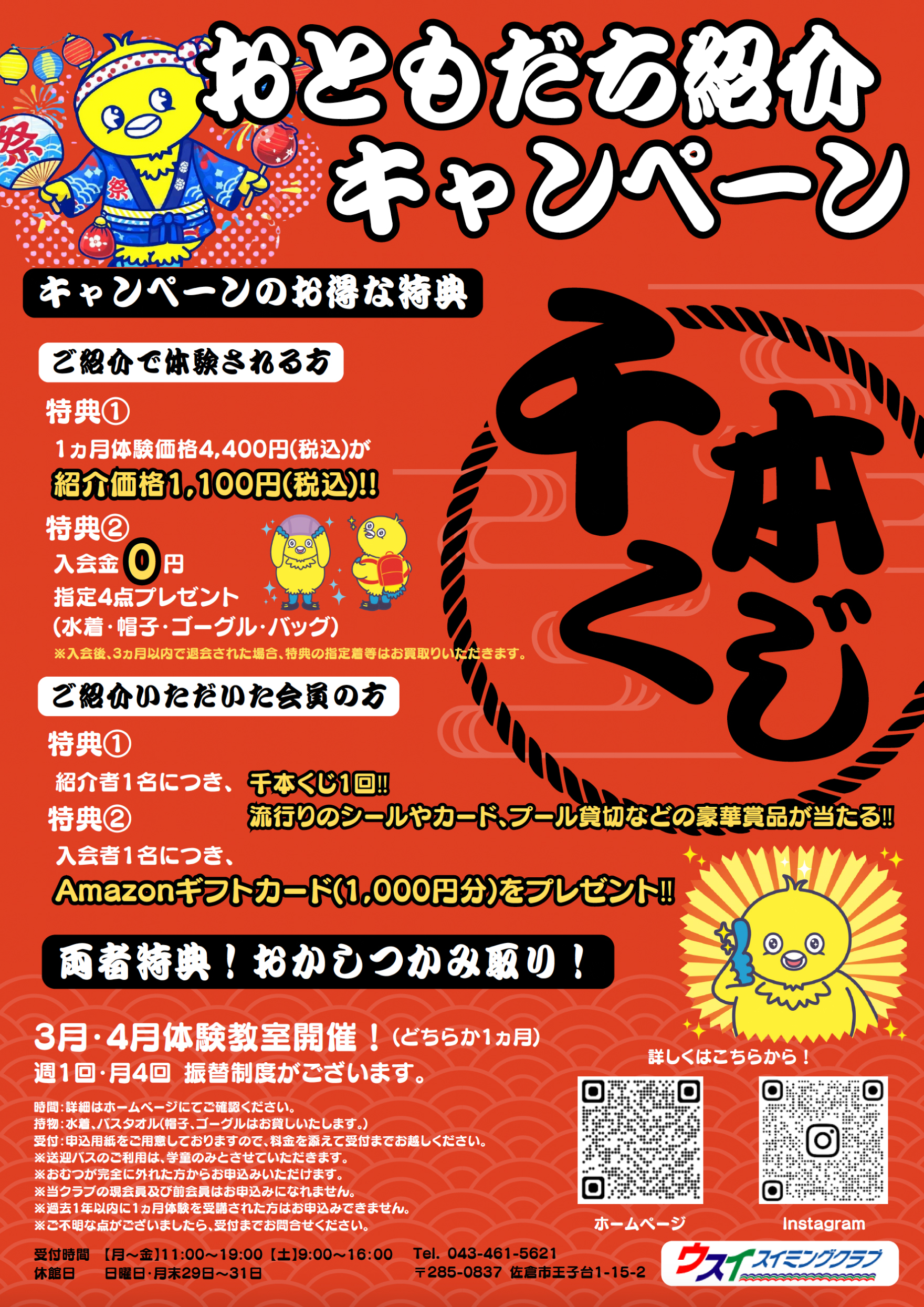 3月・4月限定。1か月体験教室、お友達紹介キャンペーンのお知らせです。 3月・4月限定の1か月体験教室のキャンペーンです。 お友達にご紹介していただくと、とてもお得なキャンペーンとなっております。 ぜひ、この機会に皆様のご参加をお待ちしております。